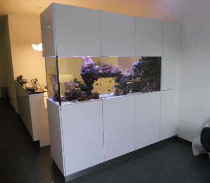 Wir verarbeiten unterschiedliche Materiealien und bieten ihnen eine Komplettlösung für ein in den Raum integriertes Aquarium an. Damit sie einen Eindruck von dem späteren Ergebnis erhalten, erstellen wir im Vorfeld für Sie eine fotorealistische Animation von jedem Vorschlag. Es gibt keine Einschränkungen und somit sagen wir: "Alles ist möglich".